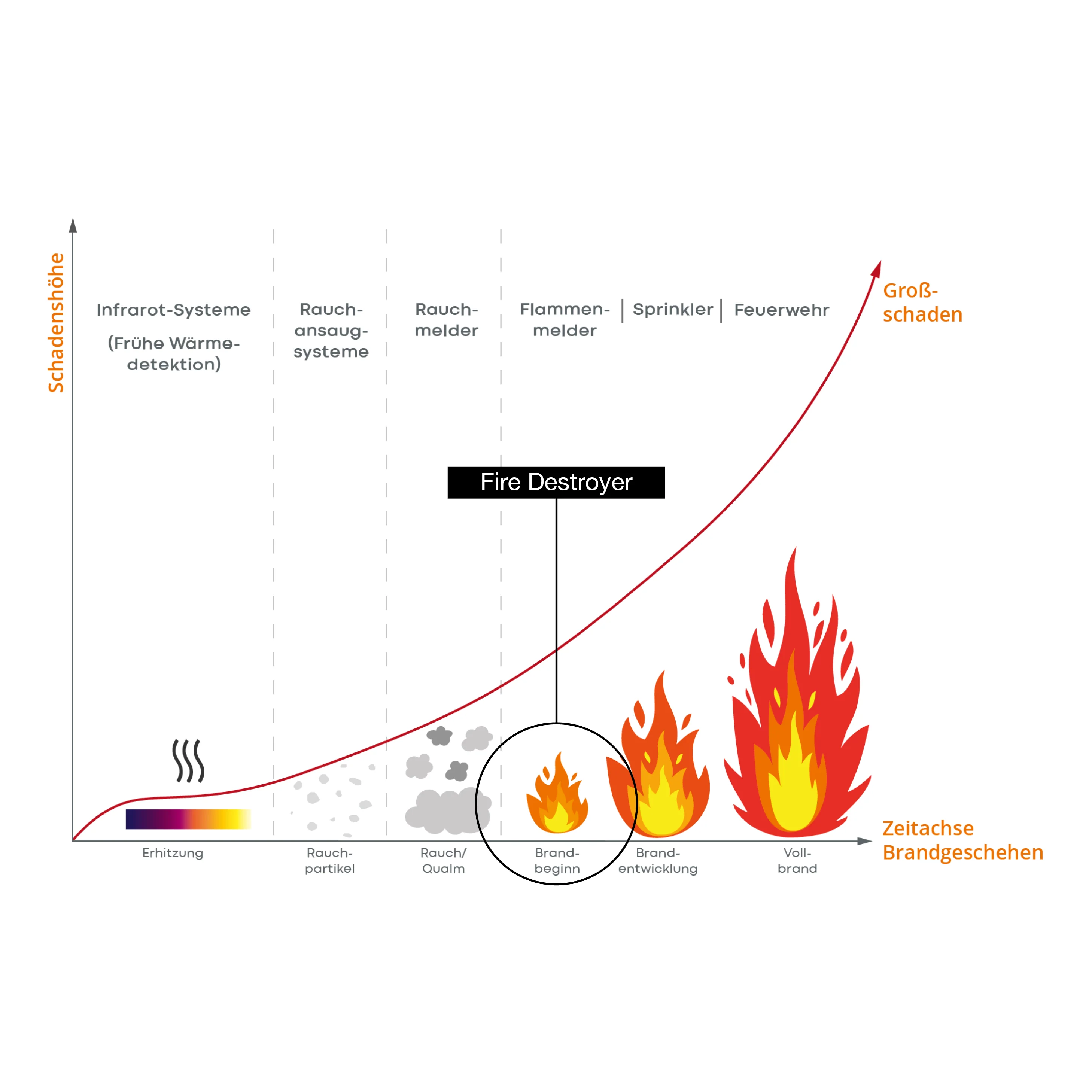 Fire Destroyer biedt effectieve bescherming voor onbeschermde en brandgevaarlijke gebieden die vaak de oorzaak zijn van branden. Ons actieve brandbeveiligingsproduct kan eenvoudig als aanvullende component in bestaande brandbeveiligingsconcepten worden geïntegreerd, waardoor de veiligheid wordt verhoogd en de schade door een brand aanzienlijk kan worden verminderd.